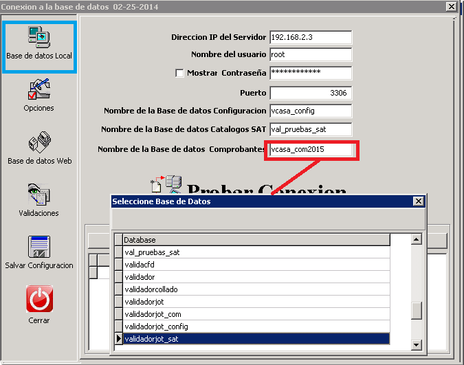 El sistema queda configurado con la base de comprobantes del año en curso , si se requiere consultar informacion de años pasados, el USUARIO tiene que ingresar a la carpeta del Validador (normalmente esta en C:\Validador) ingresamos al Configura.exe y en Base de datos local SOLO se cambiara la base de Comprobantes damos clic en esa casilla y se abrira una ventana donde muestra las bases, seleccionamos la que corresponda.