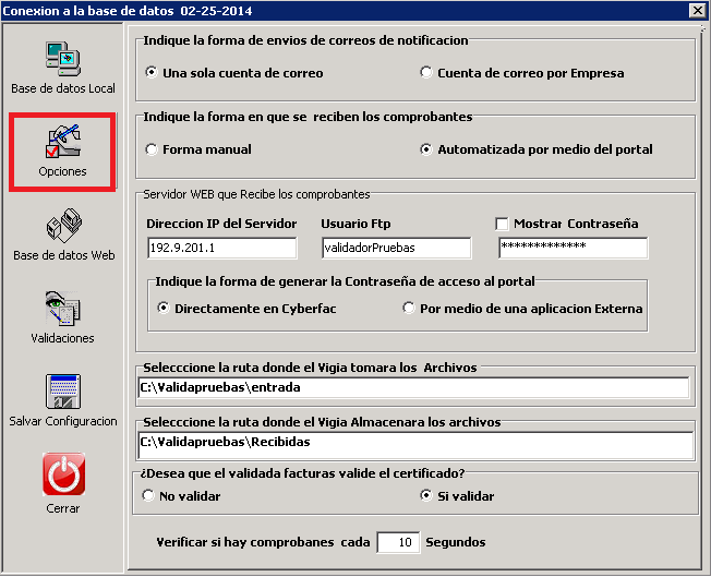 Aqui es importante configurar las rutas donde esta el sistema, esta configuracion se realiza tanto en el servidor como en el cliente. Si se cuenta con portal se selecciona y aparecen las ventanas donde hay que ingresar la direccion IP donde esta el portal, el usuario y contraseña FTP y ponemos el tiempo en el que el vigia checara la carpeta de entrada.