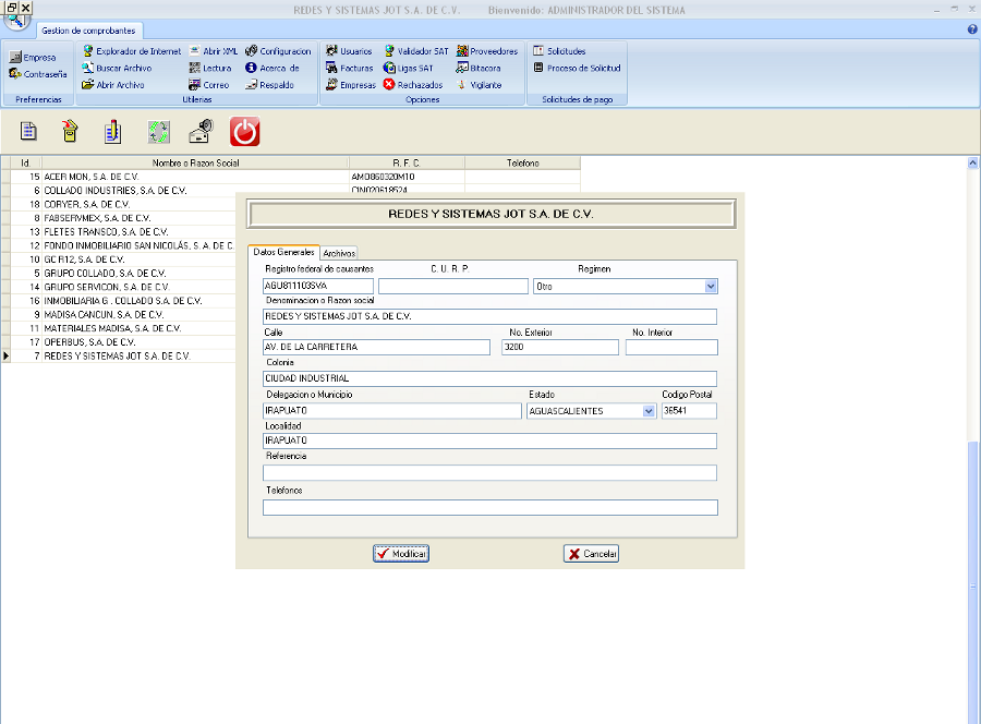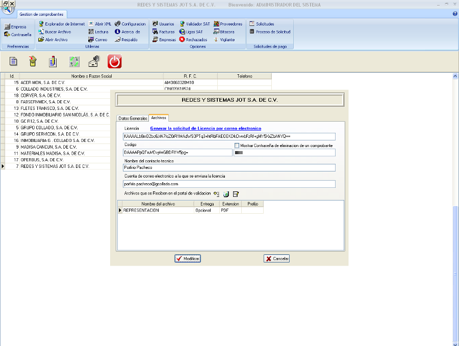 pantalla con la cual podremos modificar los datos generales de dicha empresa