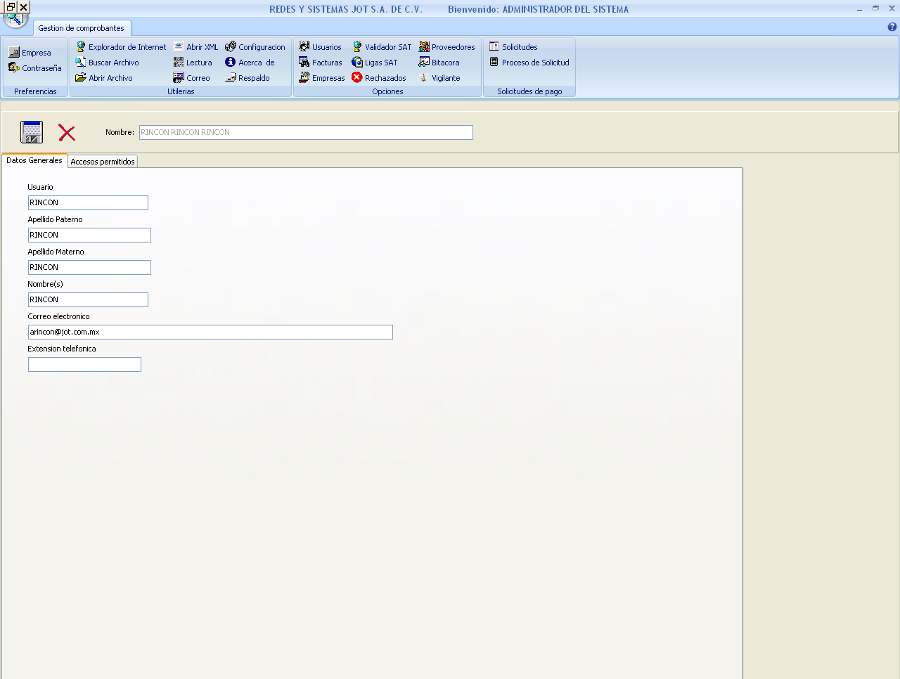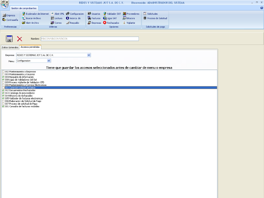 Accesos Permitidos: En esta ventana asignaremos los permisos a cada usuario y por empresa, indicando a que empresa y a que opciones podra acceder.