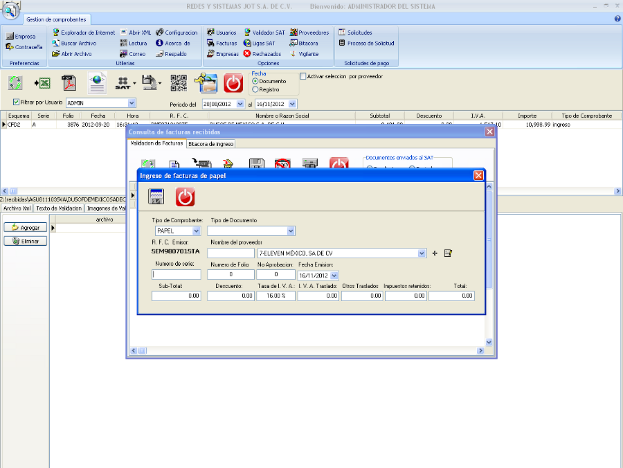 Consulta de Facturas en PapelEn esta pantalla podremos gestionar nuestros documentos en papel o CBB en esta ventana ingresaremos los datos de nuestras facturas o importar los datos, tambien nos da la posibilidad de poder enviar la informacion de las facturas al SAT. Al crear un nuevo documento se nos mostrara la siguiente ventana en la cual ingresaremos los datos que se nos indica