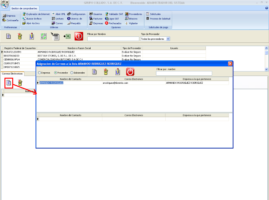 ProveedoresEn el boton de proveedores podremos ver nuestro catalogo de todos los proveedores que tenemos dados de alta, estos se pueden dar de alta de manera manual o se dan de manera automatica, esto es cuando llega una factura y el proveedor no se encuentra en la base de datos el sistema en automatico lo dara de alta, posteriormente se asignara que usuario sera responsable del proveedor. Para marcar a un proveedor como seguro daremos clic derecho y seleccionaremos la opcion de proveedor seguro ya que el sistema cuando da de alta un proveedor en automatico le da el estatus de proveedor NO seguro, esto es para que los proveedores conocidos y se han validado varias facturas se pasen a un estatus seguro y no se tenga que realizar la validacion al 100% solo la validacion del sistema. Cuando una factura de algun proveedor es incorrecta enviara notificacion por default al administrador del sistema, para asignar a un usuario distinto basta con dar doble clic sobre el proveedor el cual mostrara la siguiente pantalla en la cual podremos asignar el usuario al cual notificara cuando una factura de ese proveedor sea invalida. Si se desea que se envie notificacion en automatico al proveedor cuando la factura sea invalida se agrega el correo dando clic en el boton de agregar como se muestra en la siguiente imagen, de esta misma forma podremos agregar otros correos para la notificacion solo basta con dar doble clic sobre el correo y en automatico lo pasara a la parte de abajo, todos los correos que se agreguen se les notificara cuando alguna factura sea invalida.