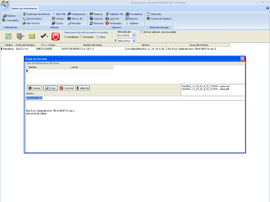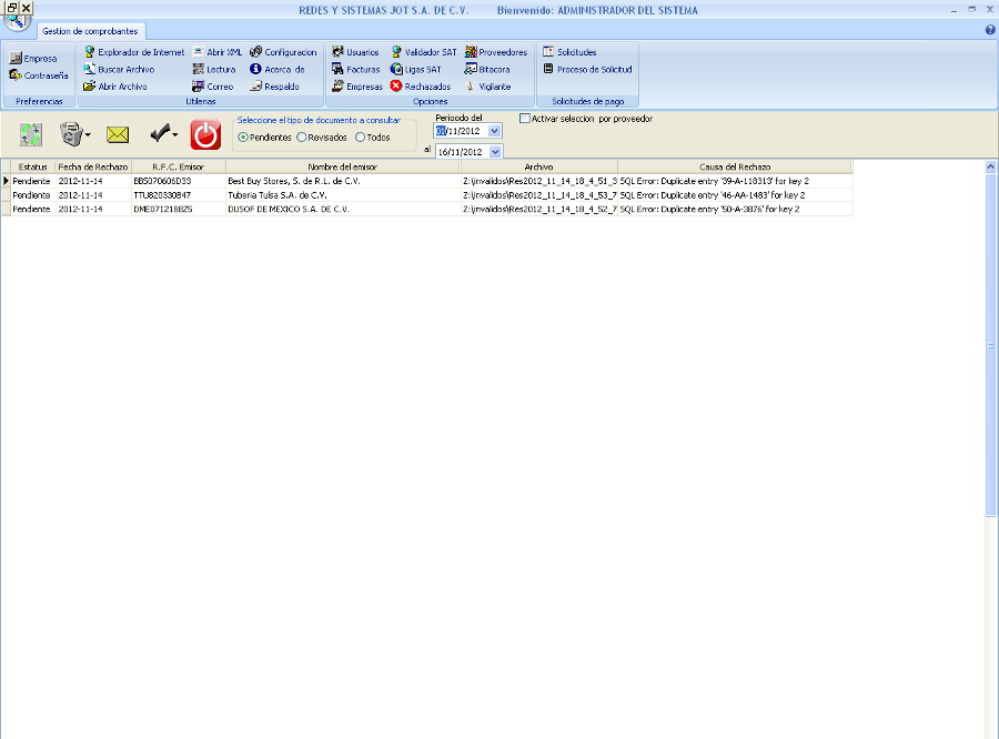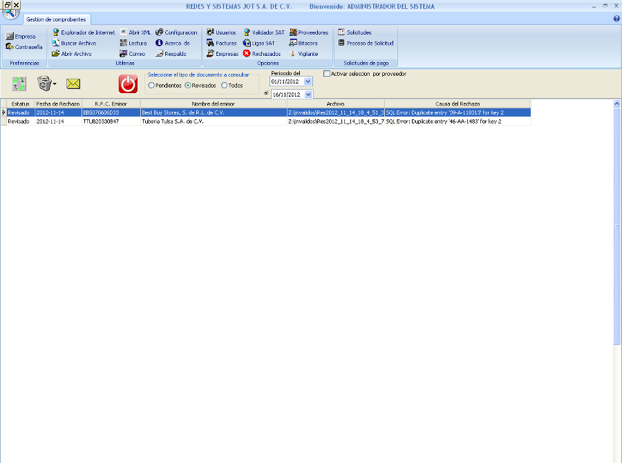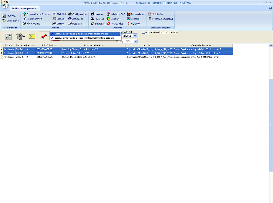 El boton de nos mostrara todas las facturas que han sido rechazadas asi como donde se almaceno, los datos del emisor, el estado de la factura