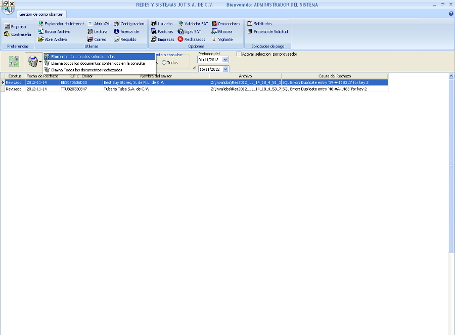 la factura de los rechazados dando clic en el boton el cual nos mostrara varias opciones para eliminar los documentos ya sea todos lo documentos, uno solo o varios.