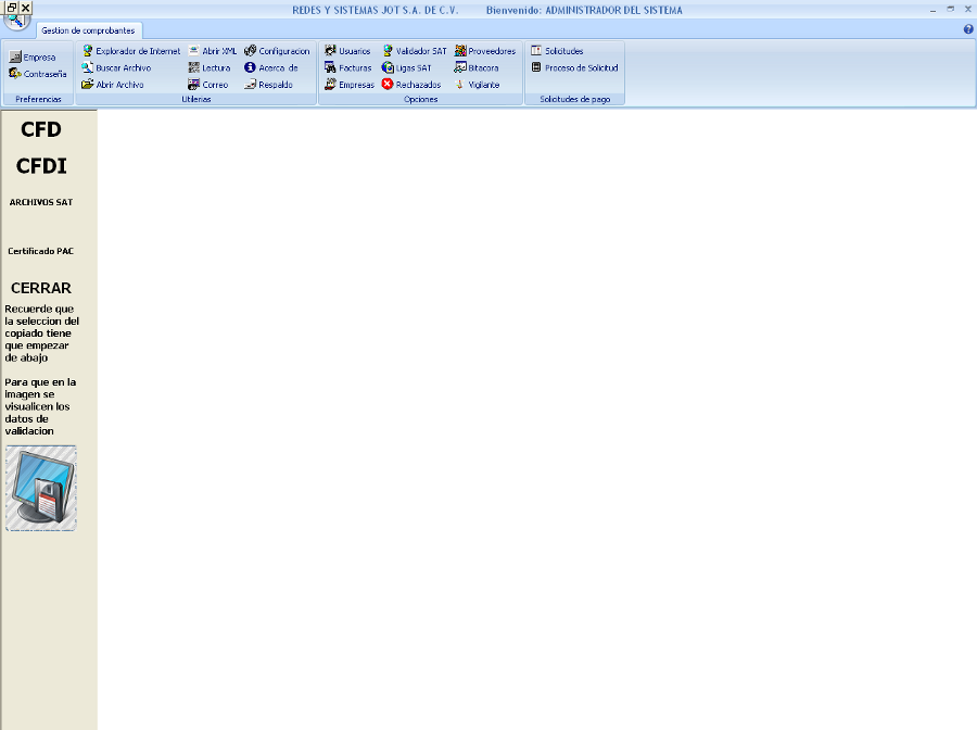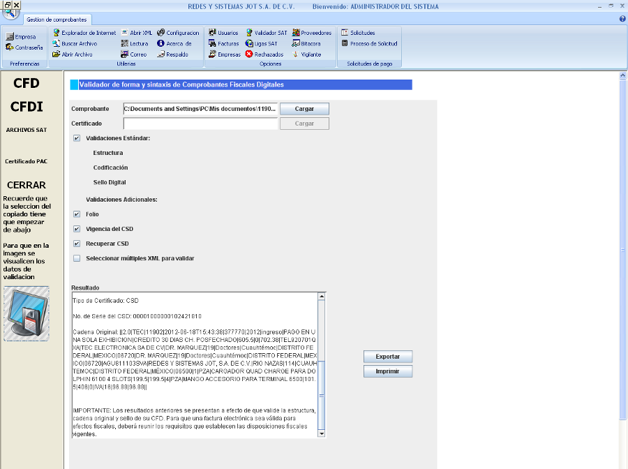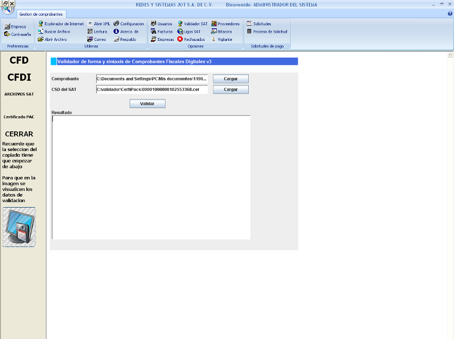 Validador SATEl boton de Validador SAT nos mostrara la siguiente pantalla en la cual nos permitira validar facturas pero de modo manual o como se hace normalmente. Al dar clic en el boton de CFD nos mandara automaticamente a la liga del SAT donde se validan las facturas CFD, tendremos que ingresar los datos que nos pide los cuales son el comprobante fiscal a validar y seleccionaremos las casillas que muestra la siguiente imagen lo cual sirve para que se valide la estructura, folio, sello, vigencia y obtenga el CSD. Al dar clic en el boton de CFDI nos mandara automaticamente a la liga del SAT donde se validan las facturas CFDI, tendremos que ingresar los datos que nos pide los cuales son el comprobante fiscal a validar y el Certificado de Sello Digital, posteriormente daremos clic en el boton de validar. |