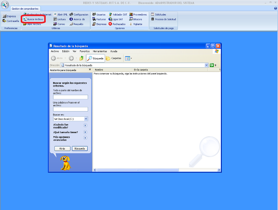 Abre una ventana en el explorador con la opcion de busqueda de archivos.
