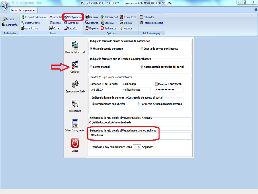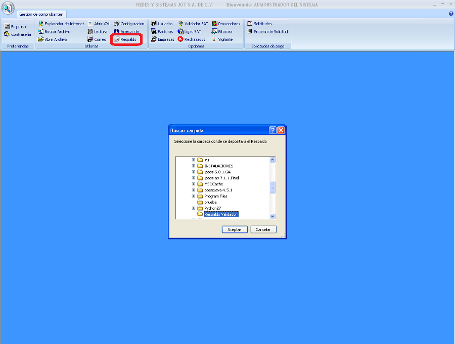Herramienta para respaldar el sistema al dar clic seleccionaremos el lugar donde guardaremos una copia del validador asi como tambien de la base de datos.