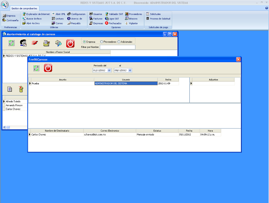 Este boton nos mostrara el catalogo de correos electronicos, aqui se daran de alta todos los correos a utilizar como contacto y para el envio de notificaciones,