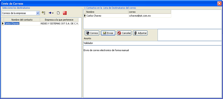--Este boton nos permitira enviar un correo de forma manual a cualquier contacto que se tenga dado de alta en el sistema se pueden adjuntar archivos, seleccionar el o los destinatarios, redactar el correo y enviarlo.